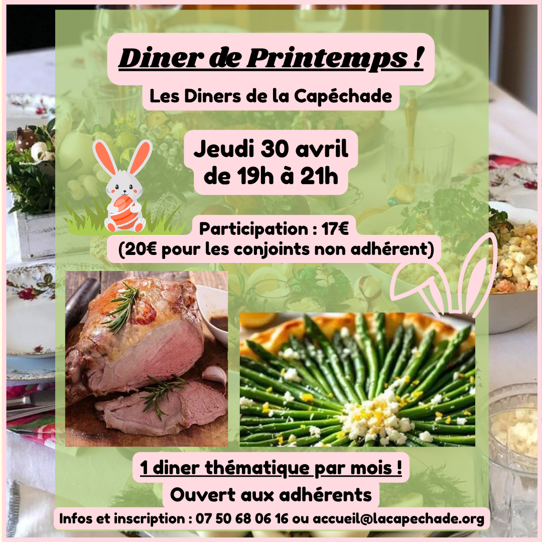 le Dîner de Printemps ✨ La Capéchade vous invite à un nouveau moment convivial et gourmand autour d’un dîner thématique préparé par une équipe de bénévoles. 📅 Jeudi 30 avril à 19h 📍 Salle commune – La Capéchade Au menu : • Amuse bouche • Quiche aux asperges • Agneau de 7h et son accompagnement […]